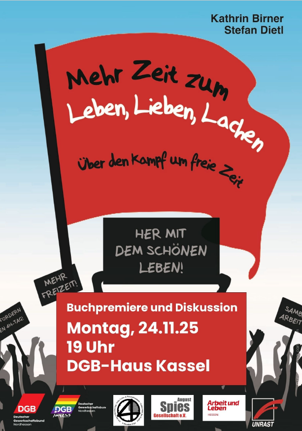Der DGB Nordhessen, die DGB Jugend Nordhessen und die Vierstundenliga Kassel möchten euch gerne zur Premiere des unlängst im Unrast Verlag veröffentlichten Buches unserer Kolleg*innen Kathrin Birner und Stefan Dietl „Mehr Zeit zum Leben, Lieben, Lachen“ einladen.