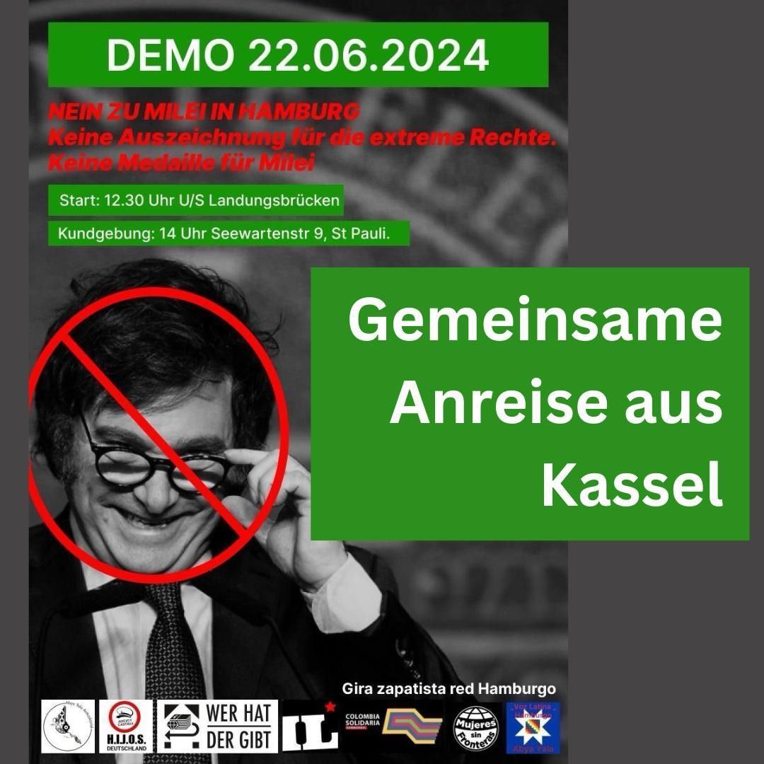 В субботу 22.06. veranstaltet Abya Yala Anticolonial Hamburg eine Kundgebung, Demonstration und Küfa anlässlich des Besuchs von Javier Milei in Hamburg. Die Veranstaltung bildet den Höhepunkt des Anti-Milei Monats, von dem wir als Sacrifice Zone Teil sind. Den Besuch und die Ehrung von Mileis “anarcho-libertären” Abbau des Sozialstaates; den Ausverkauf Argentiniens lassen wir nicht unkommentiert. Die Menschen welche in den letzen Tagen in Buenos Aires zu tausenden auf die Straße gingen und brutaler Polizeigewalt gegenüberstanden lassen wir nicht allein! Kommt mit uns nach Hamburg!