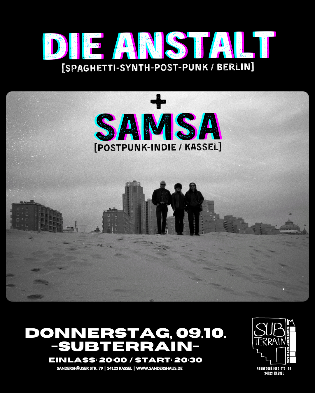 samsa wurde 2023 von Daniel Wenderoth (Gesang/Gitarre) Lennart Fenge (صوت عميق) und Tim Hochschorner (الطبول) تأسست. Mit ihrem Mix aus shoegazigen Gitarreneffekten und chaotischen Post-Punk Beats schaffen die drei Kasseler einen Sound, der musikalisch wie auch lyrisch irgendwo zwischen Unsicherheit, Euphorie und Straßenlärm liegt. هم 2025 veröffentlichte Debüt-Single „niewieder.“ zeigt, dass die Band eine klare Kante in den zeitgenössischen Indie bringt und sich nicht vor unkonventionellen Soundexperimenten scheut.