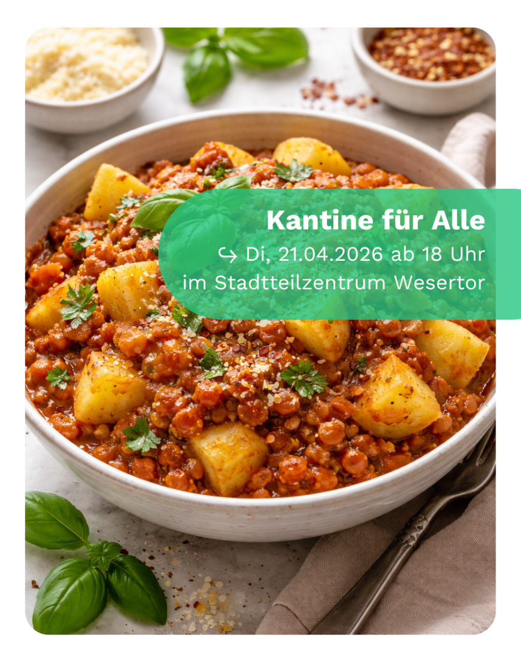 Stołówka to projekt organizacji non-profit Nutrition Council Kassel and Region. Projekt otrzymuje dofinansowanie z Paktu przeciwko Ubóstwu z Kassel. Centrum dzielnicy Wesertor znajdziesz na Weserstraße 26, Kassel. Pobliskie przystanki to Weserspitze lub rzut beretem z liniami 3, 6 A 7.