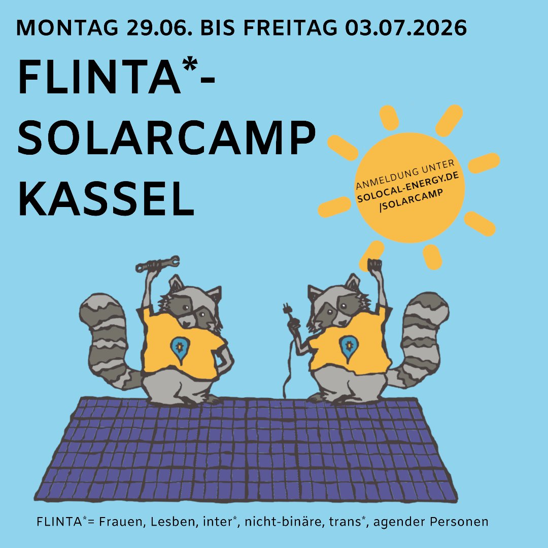 Dieses Jahr veranstalten wir nach den tollen Erfahrungen im letzten Jahr wieder ein SolarCamp ausschließlich für FLINTA* (mujeres, Lesbianas, enterrar*, no binario, trans* & agender Personen)! de 29. junio para 3. julio en la Waldschule Kassel lernen die Teilnehmenden mit uns das Wichtigste, was es rund um die Photovoltaik zu wissen gilt. Vormittags gibt’s die nötige Theorie zu Photovoltaik, Elektrotechnik und Arbeitssicherheit an die Hand, nachmittags wird dann am Musterdach und einer Demo-Anlage geschraubt.