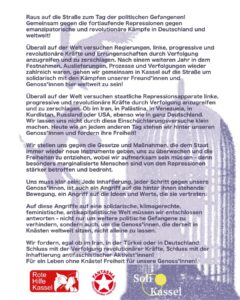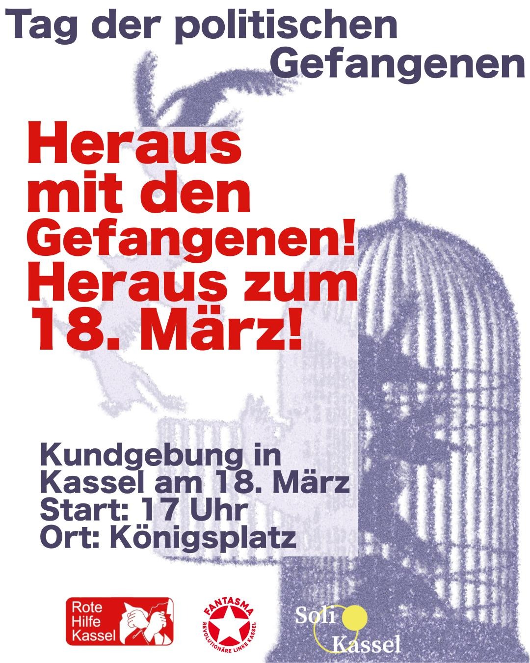 Fuera los presos! Fuera a 18. marzo! 18.03.2026 17:00 - 19:00 Königsplatz, Kassel manifestación Enlace al evento Guardar en calendario: WebCal | iCal | Calendario de GoogleInformar un error
