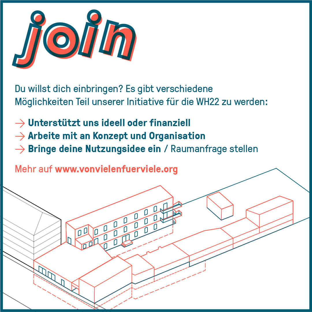 Seit vielen Jahren sind Räume für Kunst, (子)Kultur und für soziales wie gesellschaftliches Engagement in Kassel Mangelware. Räume zum Zusammenkommen, Diskutieren, Ressourcen teilen, gemeinsam arbeiten, voneinander lernen, Zeit verbringen und natürlich auch feiern. Dies wollen wir ändern! Zusammen wollen wir die WH22 als gemeinschaftlich getragenen Ort für Kultur, Bildung und gesellschaftliches Engagement langfristig erhalten und weiterentwickeln!