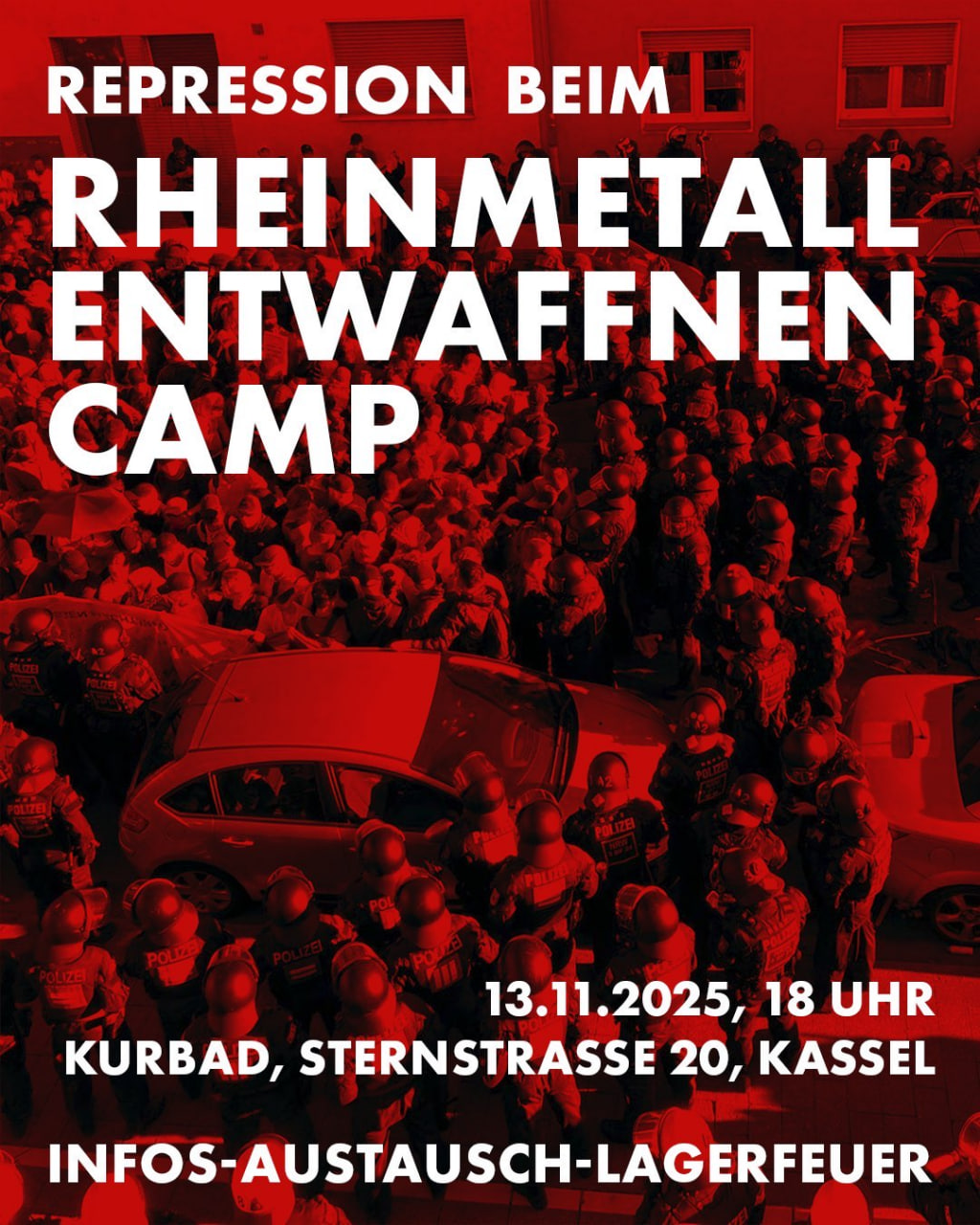 Wenn du von Repression betroffen bist, während des Camps in einer Polizeimaßnahme warst, bereits Post bekommen hast oder dich mit deinen Erlebnissen alleine fühlst, bist du herzlich eingeladen zu kommen! Die Veranstaltung richtet sich exklusiv an alle Menschen, die in diesem Jahr Teil des Rheinmetall Entwaffnen Camps und der Aktionstage waren. Ihre Repressionen kriegen uns nicht klein – wir stehen zusammen, im Widerstand vereint!
