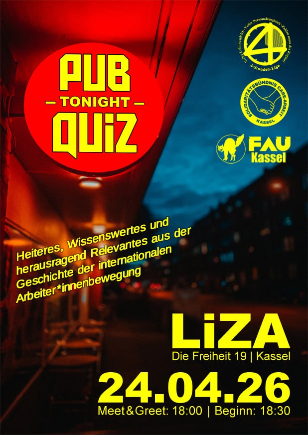 Eine Woche vor dem 01.Mai laden wir zum Kneipenquiz ins LiZA. Ihr spielt in Teams, die sich einfach vor Ort bilden, wenn ihr nicht bereits als Gruppe antretet. Es wird um Heiteres, Wissenswertes und herausragend Relevantes rund um die Geschichte der internationalen Arbeiter:innenbewegung gehen. Nicht lediglich euer Wissen wird euch zum Sieg führen, auch Geschicklichkeit und Kreativität sind gefragt. Gestärkt durch den gemeinsamen Abend, sehen wir uns dann am 01.Mai entschlossener denn je auf der Straße!
