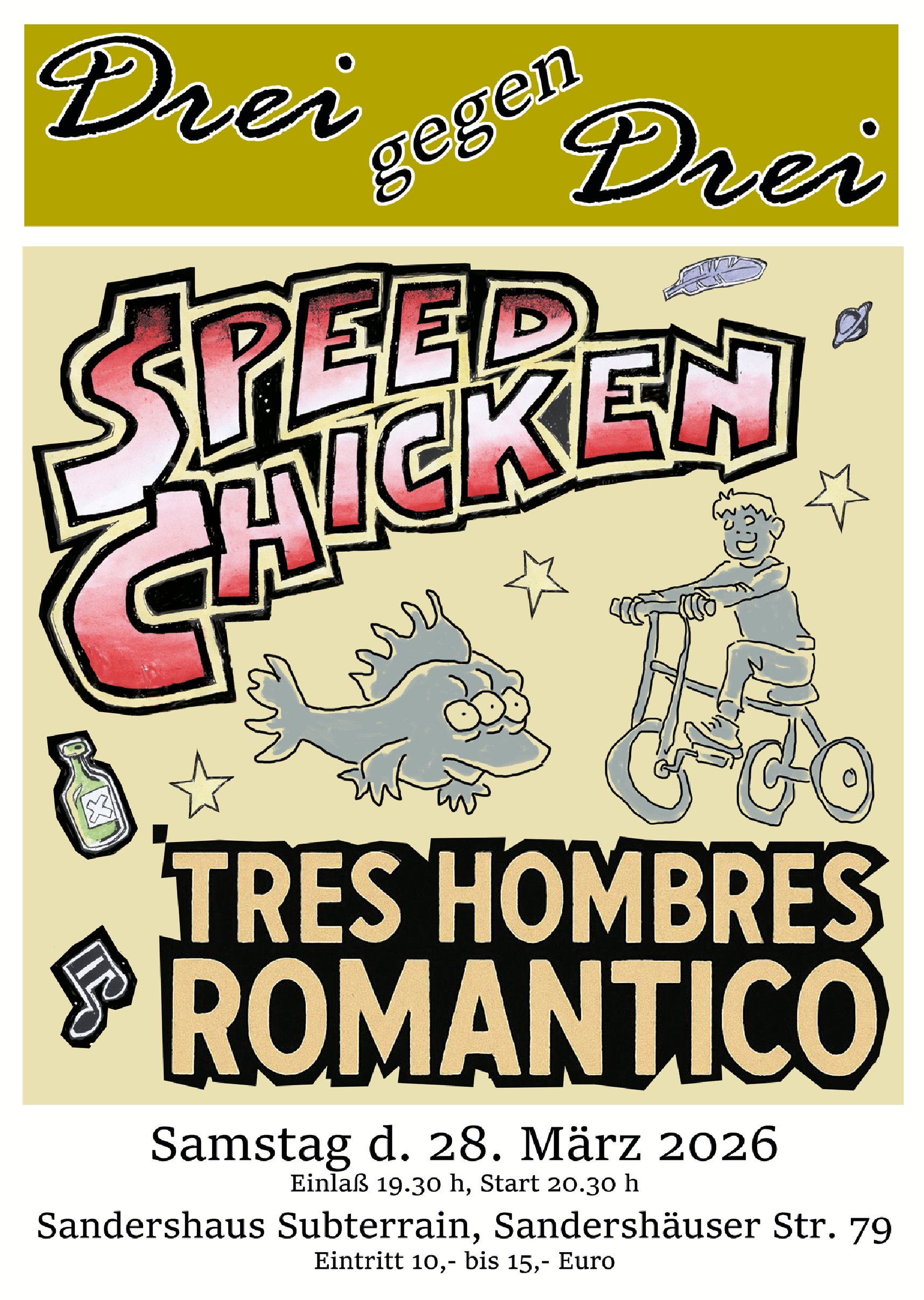 Die 3 Herren aus Nordhessens Künstlernekropole pflegen mit Verve ihre Leidenschaft für den Rock’n’Roll und den Garagenrock und ihre Musik ist, wie sollte es anders sein, beeinflusst von deren großartigsten Helden und Underdogs. Für einen ausgelassenen Abend kommen die immer gut aufgelegten Herren dieses Mal im Sandershaus vorbei um zusammen mit Speed Chicken einen unvergesslichen Abend zu zelebrieren.