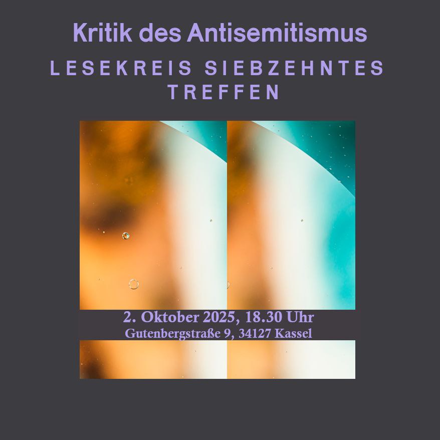 Darin setzen sich die Autor:innen mit den gesellschaftstheoretischen Grundlagen der sogenannten antideutschen Antisemitismuskritik, u.a. auch mit dem Aufsatz von Moishe Postone, den wir bereits im Lesekreis diskutiert haben, auseinander. Wir freuen uns wie immer über neue Gesichter, Interessierte und alle, die wieder einsteigen wollen.