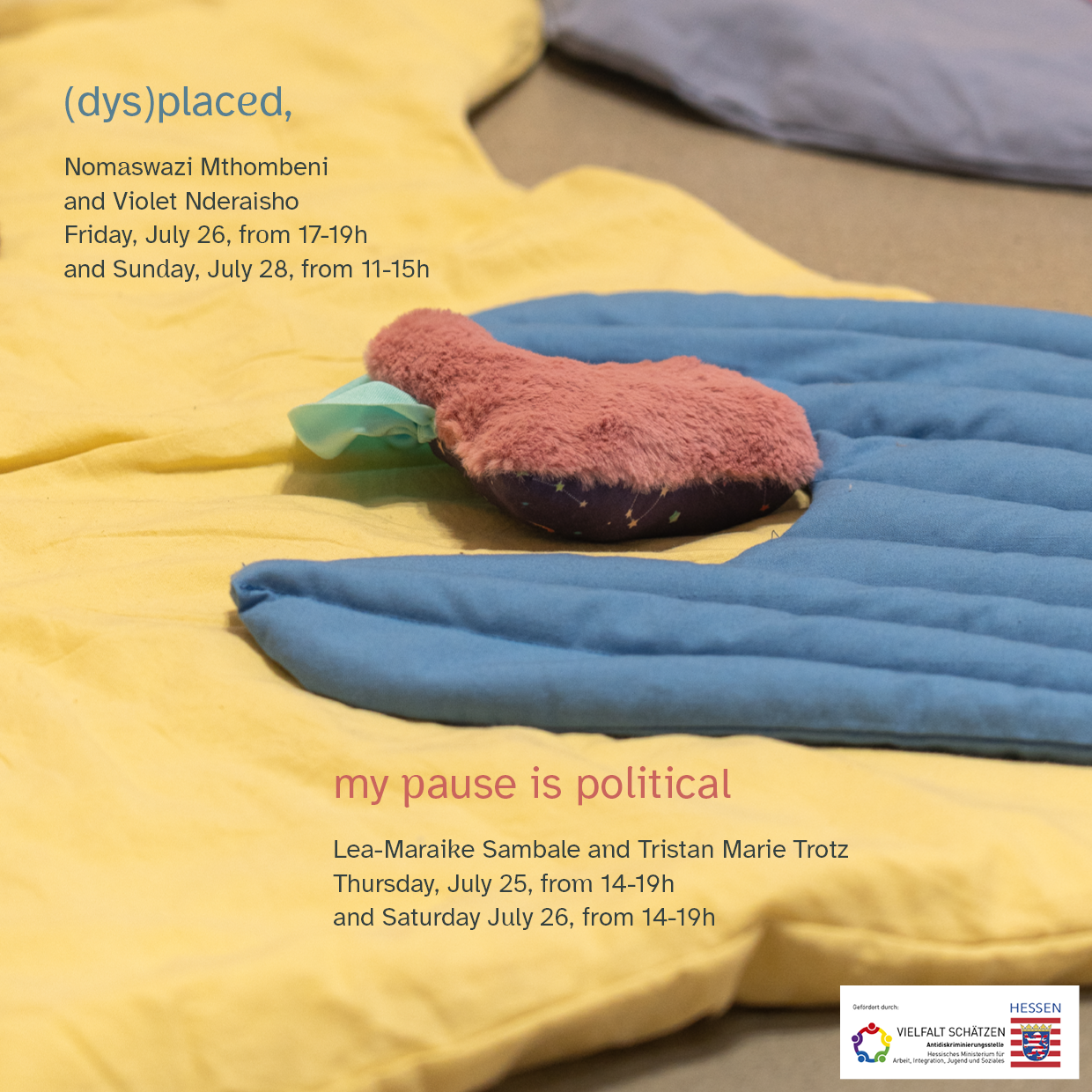 Na warsztatach Moja przerwa jest polityczna odkrywamy nieposłuszne możliwości przerw, Dbanie o siebie i wzajemna troska. Robimy sobie przerwę, żeby się wzmocnić. Odpoczywamy i skupiamy się ponownie. Do swojego ciała i potrzeb podchodzimy różnymi ćwiczeniami percepcji. Poznajemy sieci opieki, Crip-Time i teoria łyżek wiedzą o tym i wymieniają się pomysłami na ten temat, co te praktyki mają z nami wspólnego. Projektujemy z kojących zapachów, Kolory i powierzchnie zakotwiczają przedmioty i splatają razem delikatne prezenty i przyszłość.