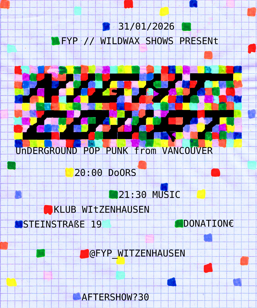 夜阁 (来自温哥华的地下流行朋克) 在维岑豪森 31.01.2026 20:00 - 23:59 俱乐部维岑豪森 音乐会 五年计划 // 野蜡表演 现在Ⓐ 夜场 来自温哥华的欧洲巡演在维岑豪森结束,传播夏日氛围. 正如所有美好的事物一样 – 明显地. 准备好与地下流行朋克一起重新体验你的童年吧,这会让你想在下一个空泳池里滑冰 (室外游泳池 2027) 并完成你的第一个踢脚翻. 所以来维岑豪森俱乐部吧 (不要相信过时的网站, 这是一个真实存在的场地!) Steinstr. 19, 37213 维岑豪森. 门 20:00 音乐 21:00 基于捐赠 保存到日历: 网络卡尔 | iCal | 谷歌日历报告错误
