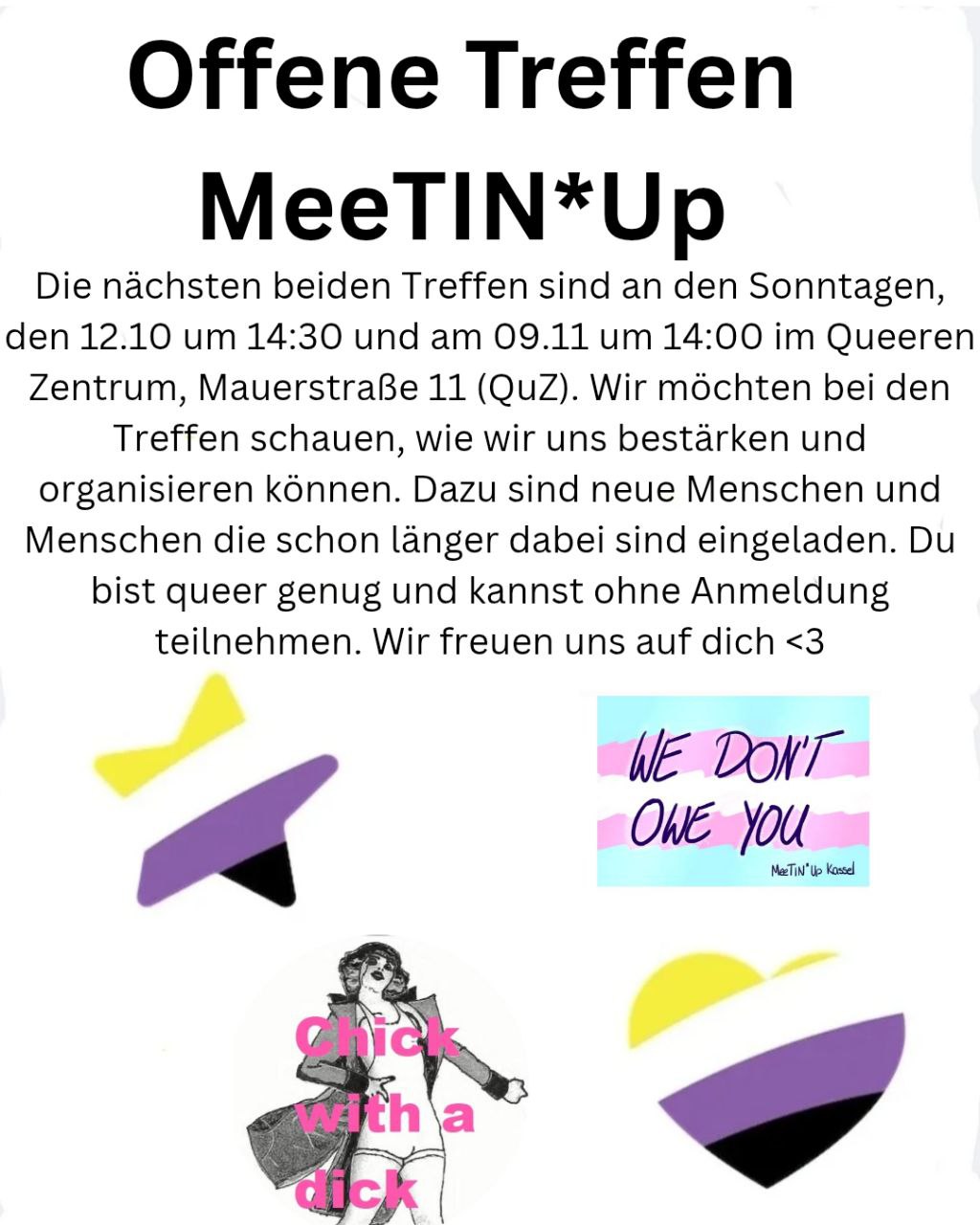 Die nächsten beiden Treffen sind an den Sonntagen, den 12.10 um 14:30 und am 09.11 um 14:00 im Queeren Zentrum, Mauerstraße 11 (QuZ). Wir möchten bei den Treffen schauen, wie wir uns bestärken und organisieren können. Dazu sind neue Menschen und Menschen die schon länger dabei sind eingeladen. Du bist queer genug und kannst ohne Anmeldung teilnehmen. Wir freuen uns auf dich <3