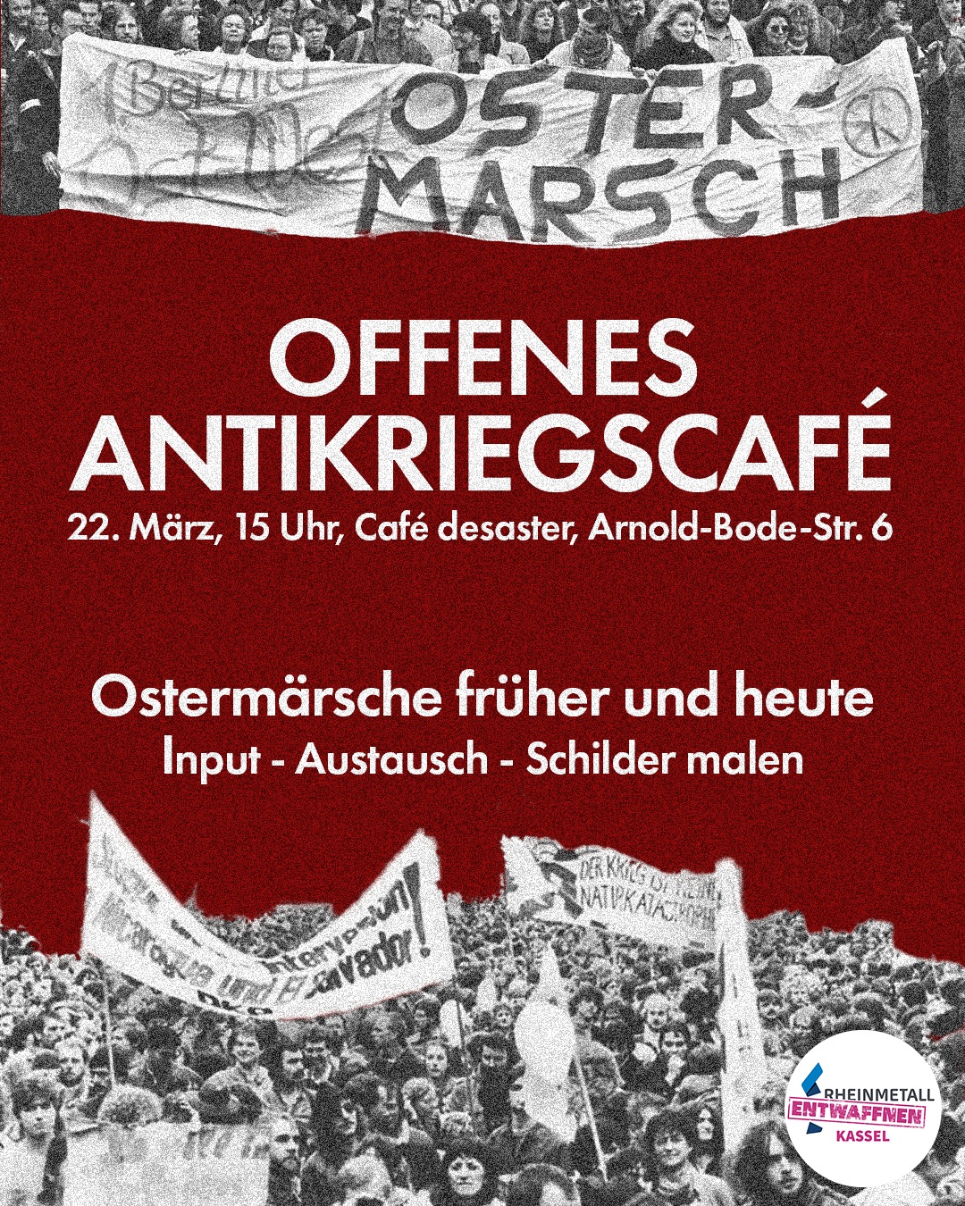 Od lat 60. XX w. w Niemczech mieszkańcy protestują w okresie Wielkanocy przeciwko zbrojeniom zbrojeniowym, Wojna i pobór na ulicach. Bei unserem offenen Antikriegscafé wollen wir uns die Geschichte der Ostermärsche anschauen und darüber ins Gespräch kommen, warum sie auch heute noch ein wichtiger Teil für uns als antimilitaristische Bewegung sind. Im Anschluss wollen wir bei Kaffee, Tee und Kuchen gemeinsam Schilder basteln und Transparente malen für die diesjährige antikapitalistische Ostermarschdemonstration am 04. kwiecień.