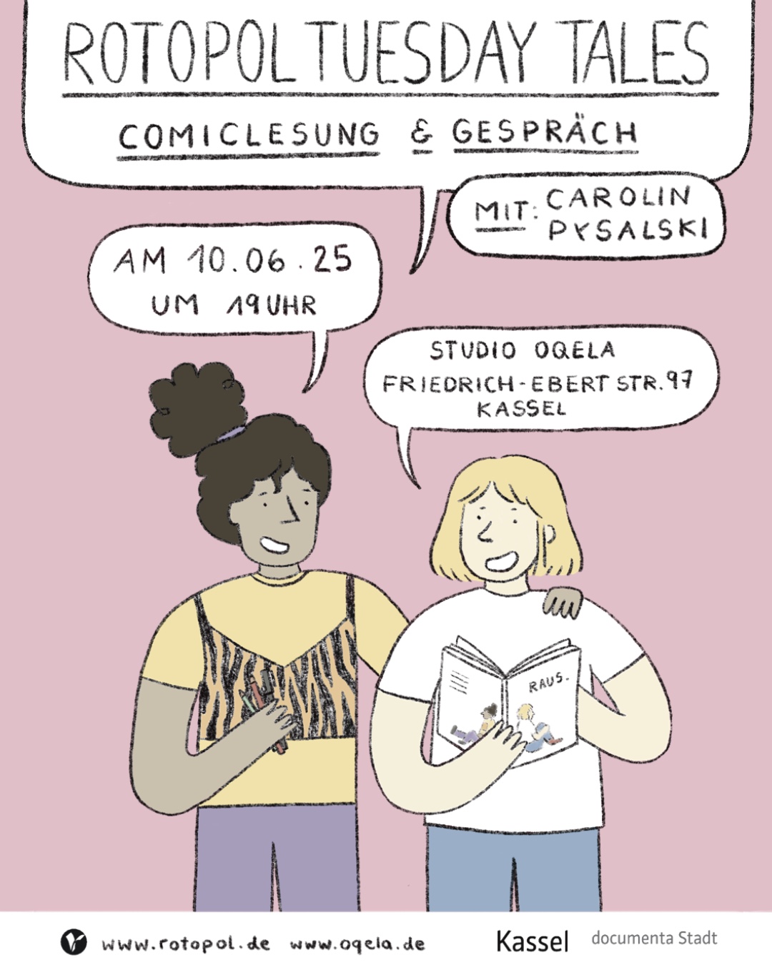 上午 10. 六月 19 艺术家 Carolin Pysalski 是 Tuesday Tales 的嘉宾,并在 oqela 工作室展示了她的漫画 Raus。, 一个关于自决和占据空间的故事. 阅读结束后将进行与艺术家的主持讨论以及原创作品展览. Pysalski 在卡塞尔艺术学院学习视觉传达,现在是一名插画家. 她的作品经常与卡塞尔市博物馆或 Raamwerk e.V 等当地项目合作创作.
