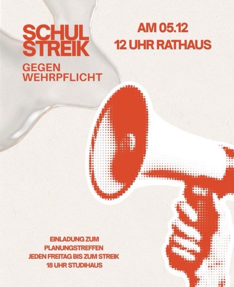 Während auf Grund der steigenden Militarisierung Gelder für die Jugend, Kultur und Schulen gekürzt werden und immer mehr Freizeit Angebote schliessen müssen um Platz für Waffenfabriken zu machen, möchten wir ein Zeichen setzen: Gegen die Wiedereinführung der Wehrpflicht und die gegenwärtigen Kriegsvorbereitungen.