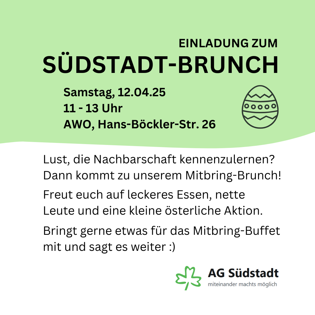 Die AG Südstadt lädt ein zum Mitbring-Brunch. Ein entspanntes Treffen zum Kennenlernen der Nachbarschaft mit einer kleinen Oster-Aktion.