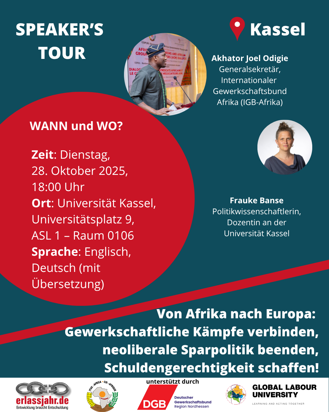 In der Diskussion wollen wir unter anderem folgenden Fragen nachgehen: Was konnte der IGB-Afrika bisher erreichen, welche Chancen und Herausforderungen sieht er? Welchen Beitrag müssen Deutschland und Europa für eine faire Entschuldung afrikanischer Staaten leisten? Welche Rolle können deutsche Gewerkschaften in diesem Zusammenhang spielen? Wie lassen sich nationale Kämpfe gegen Austerität miteinander verbinden und sich gegenseitig stärken?